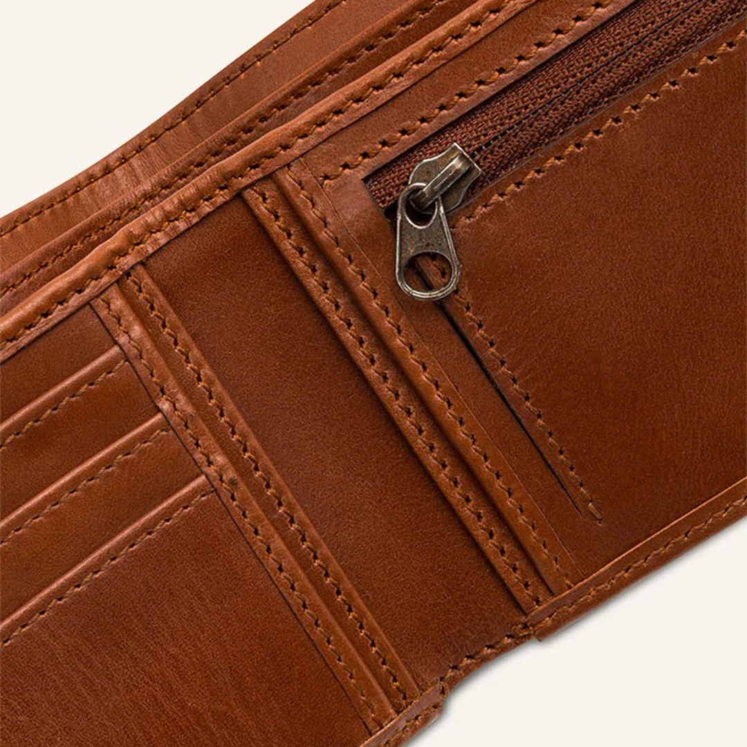Inside, it offers two spacious note compartments that easily hold large currency bills. The left side features five card slots, while the right side includes two additional slots to keep your essentials organised. A secure coin pocket ensures your change is always neatly stored and within reach.